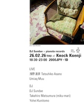 26th Feb 2026(thu) DJ Sundae×pianola records Live@Knock 2000yen + 1 drink 18:30 - 23:00 -LIVE- Tatsuhiko Asano @asanotatsuhiko Umiaq Muu @umiaqmuu -DJ- DJ Sundae @idlepress Takahiro Matsumura (miku-mari) @mi_ku_ma_ri Yohei Kunitomo DJ Sundae, based in Paris, France, runs the independent label Idle Press and has garnered widespread acclaim for his distinctive curatorial vision, spanning experimental music, dance music, and indie folk. He is especially renowned for his selection and supervision of the highly regarded compilation album Sky Girl, and will be visiting Japan. For the live acts, we have invited guitarist and musician Tatsuhiko Asano, whose work has recently drawn renewed attention with the LP reissue of the soundtrack to the cult video game Doshin the Giant, and who has also released acclaimed records on labels such as Alec Empire’s Geist Records and Moodman’s M.O.O.D. In addition, Umiaq Muu, an emerging home-recording musician from Mito, Ibaraki―whose cassette release A Brighter Summer Day was superb and well received at our shop―will also perform. DJ sets will be provided by Takahiro Matsumura and myself from conatala. The event will take place at Koenji knock, a venue known for carefully crafting consistently stimulating partys. Photo Takashi Mitsuhashi @3mi2tsu Flyer mitzdate ko @mitzdateko |