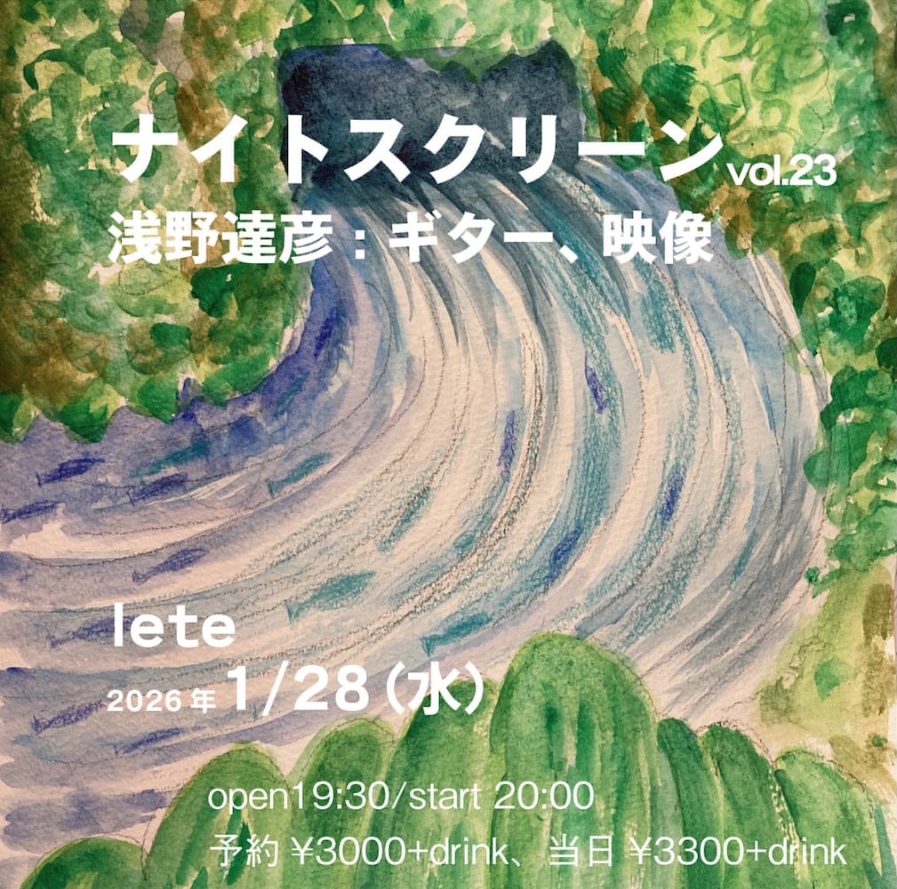 27 Mar 2025(Thu) Tatsuhiko Asano Solo Live "Night Screen vol.22" Live@lete shimokitazawa Open 19:30 / Start 20:00 Charge Adv3,000yen + drink / door 3,300yen + drink Night Screen” is a live performance with a self-made video projected on the background. The images are projected later, so the live show is inevitably seated and the lighting is darker, making it a quieter show. We always update “futon photos” and “photos of the clothes I was wearing” on the night screen. I'm looking forward to welcoming you all again. Best regards! https://l-ete.jp lete:5-33-3 Daizawa, Setagaya-ku, Tokyo 155-0032 TEL: 03-3795-0275 |